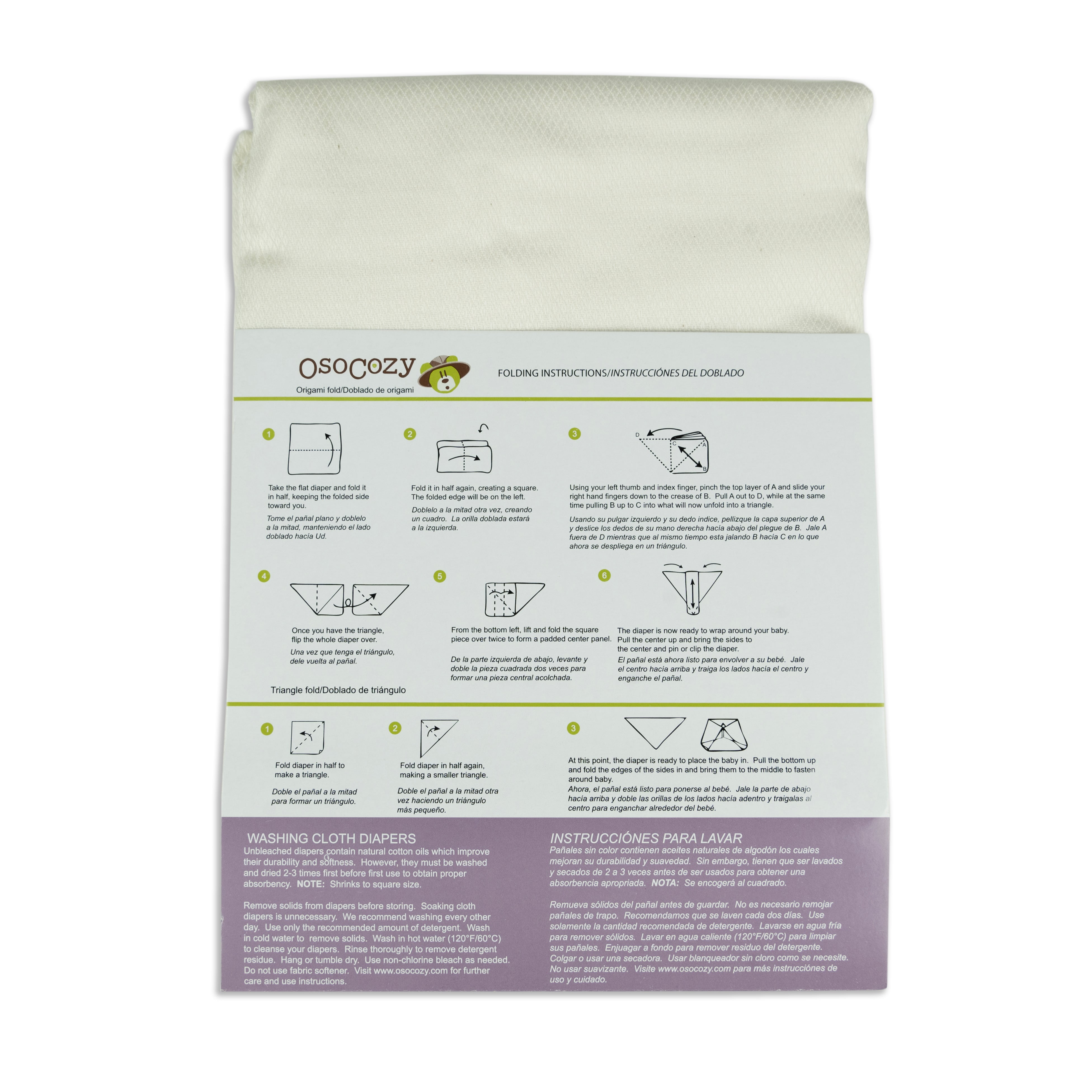 Osocozy bamboo flat diapers are sized to shrink to square for easy folding. Wash and dry on warm or hang to dry and save energy. Your results may vary. Washing and drying on high temperatures may result in extensive shrinkage.