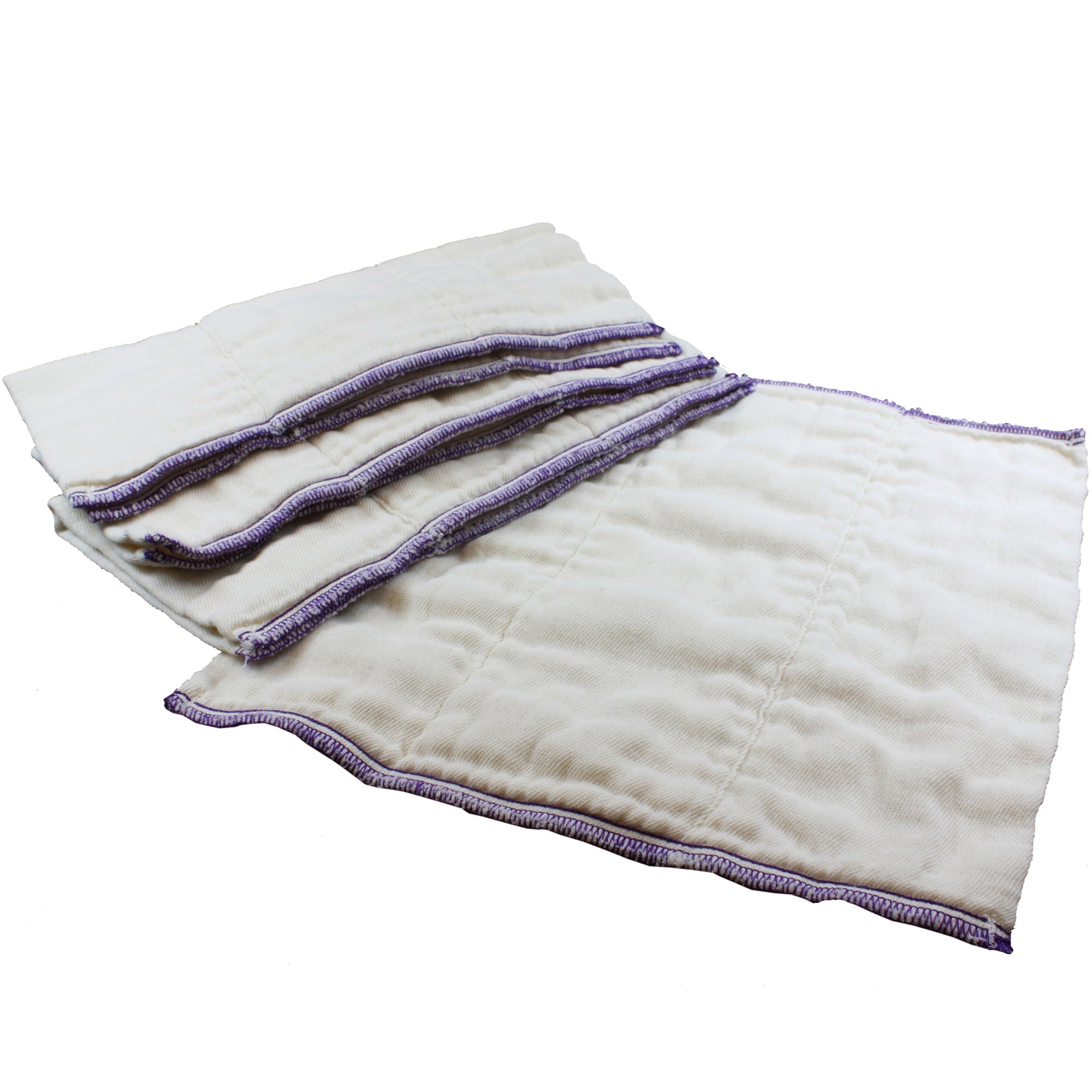 Made with soft, durable unbleached Indian cotton gauze. These prefolds quilt or fluff up nicely with the first wash. These cloth diapers are thick, very absorbent, and lint free.