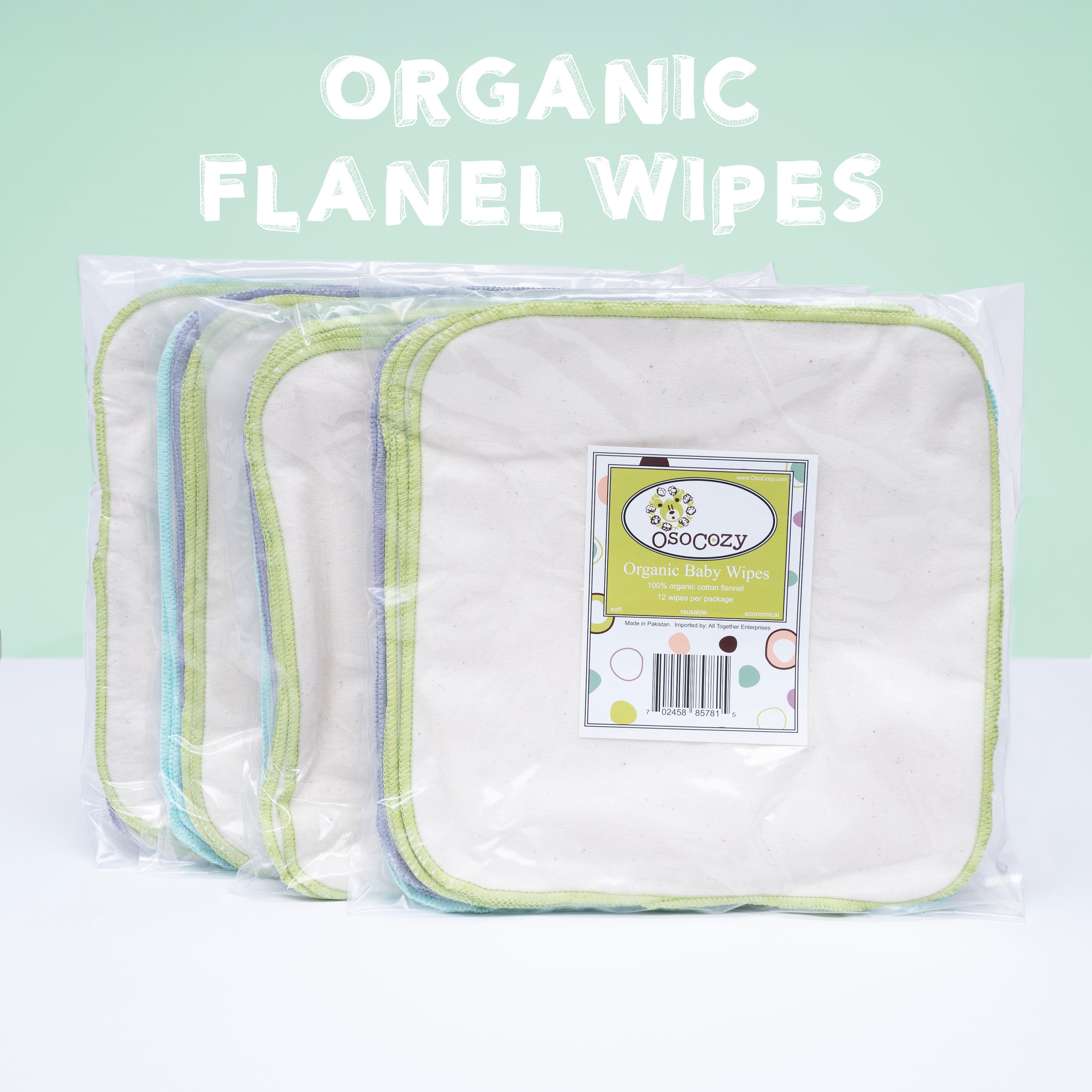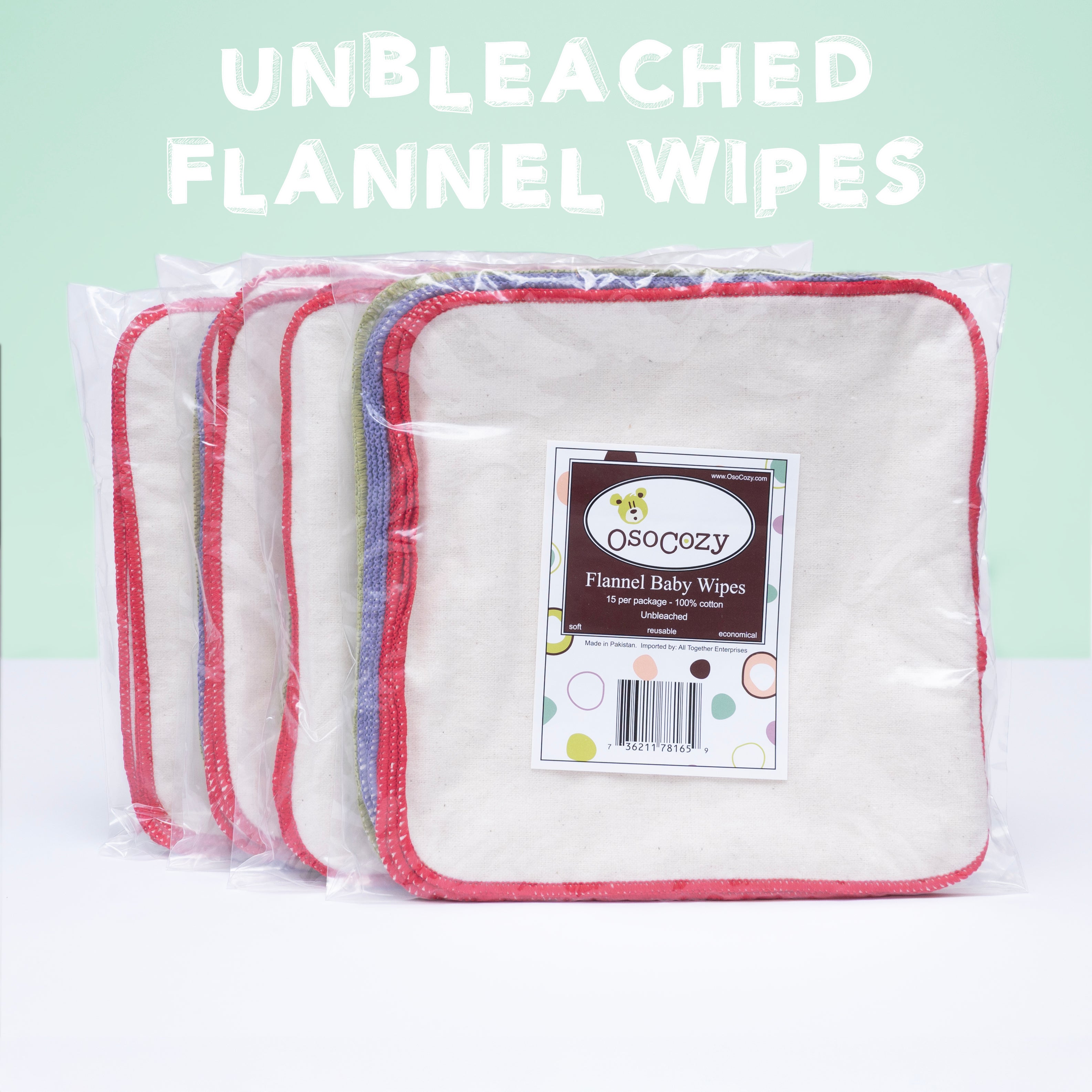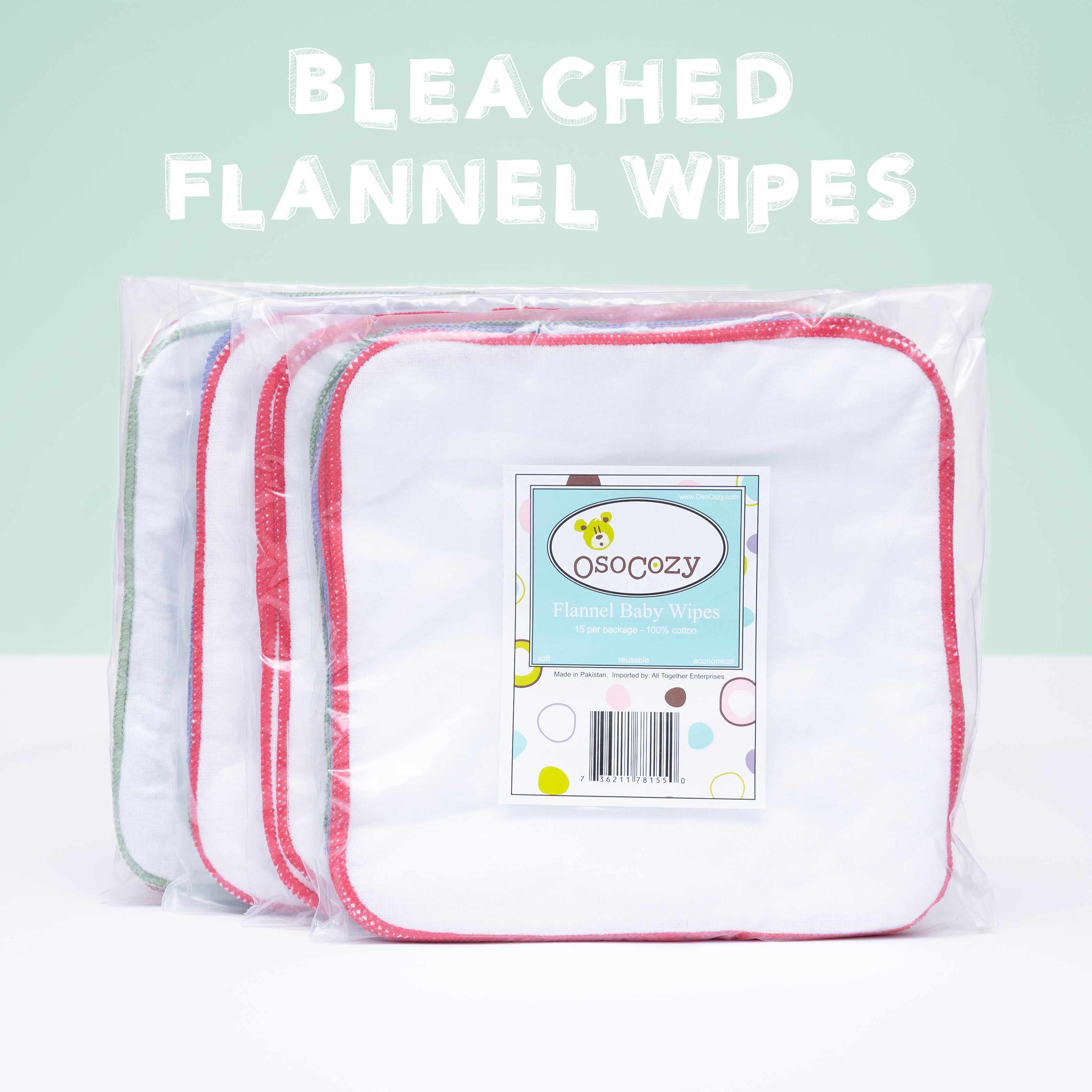 OsoCozy Flannel Baby Wipes (4 packs of 15 or 12): Enjoy the softness of 100% cotton flannel wipes, perfect for your baby's delicate skin. These 8"x8" reusable wipes, stitched with charming colors, are durable, easy to wash, and versatile enough for diaper changes, bath time, and on-the-go cleanups. Available in bleached, unbleached flannel and in organic flannel (12 packs).