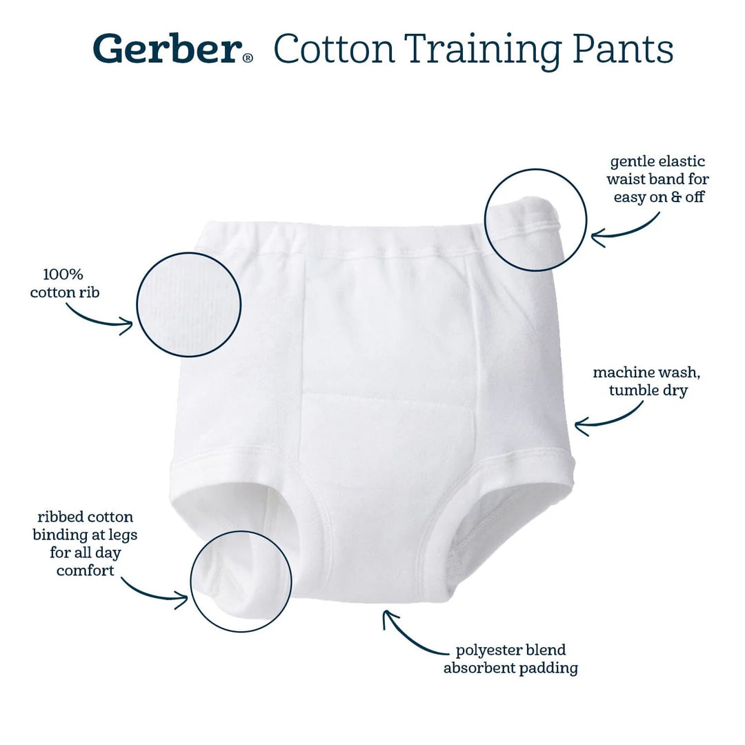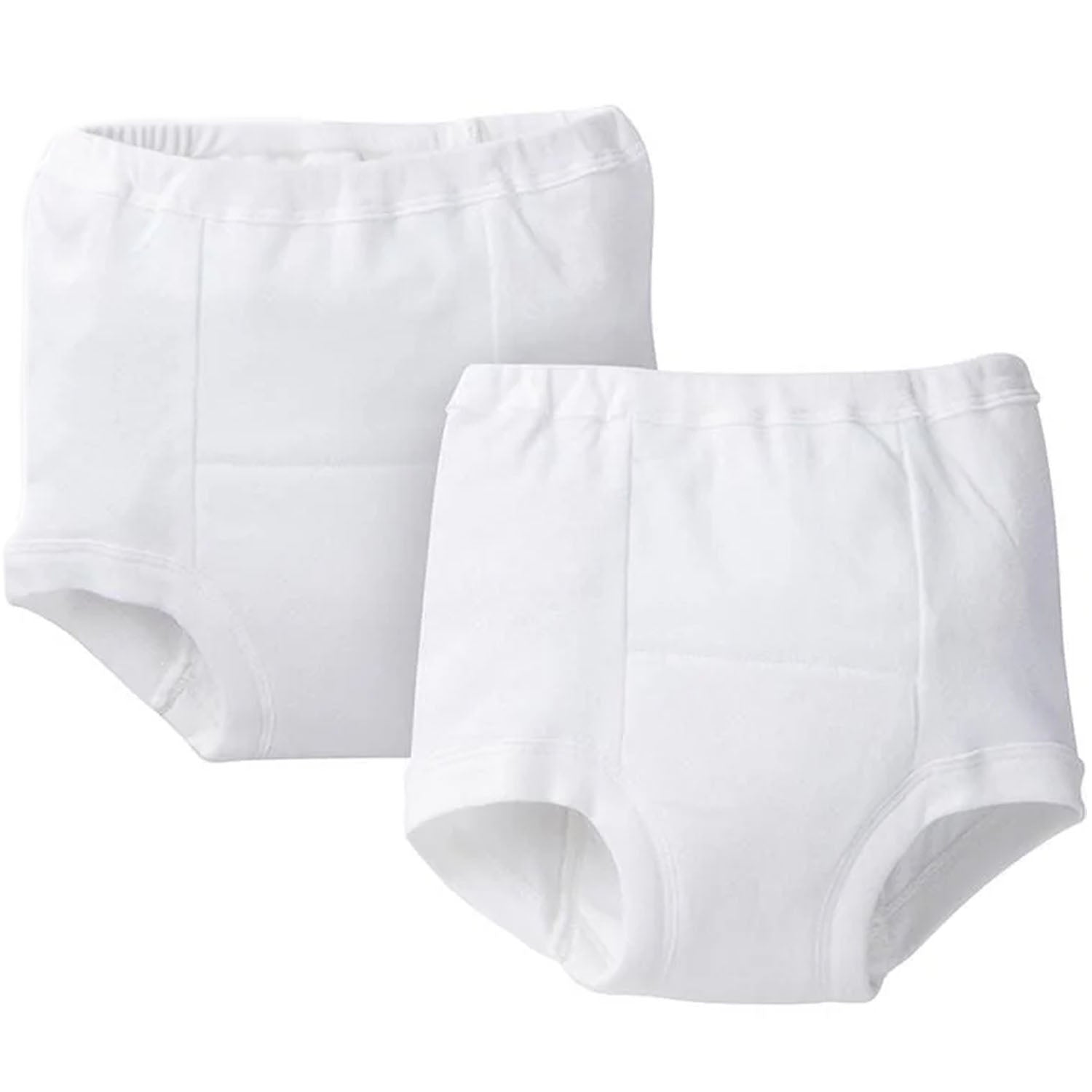 Gerber offers a wonderfully basic training pant that can be an effective potty-training tool. The center panel consists of front and back layers of 100% combed cotton and the interior is a 50/50 cotton/poly blend for added absorbency. These have enough absorbency for little leaks on the way to the toilet and are inexpensive enough to keep plenty on hand. Frequently used with Gerber Waterproof Pants to keep clothing dry. They are also great under pants for toddlers through size 3T (approx. 35 lbs). Boys' and girls' colors are sold in 2 packs. White training pants are sold in 3 per package.