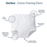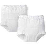 Gerber offers a wonderfully basic training pant that can be an effective potty-training tool.  The center panel consists of front and back layers of 100% combed cotton and the interior is a 50/50 cotton/poly blend for added absorbency.  These have enough absorbency for little leaks on the way to the toilet and are inexpensive enough to keep plenty on hand.  Frequently used with Gerber Waterproof Pants to keep clothing dry. They are also great under pants for toddlers through size 3T (approx. 35 lbs). Boys' and girls' colors are sold in 2 packs.  White training pants are sold in 3 per package.