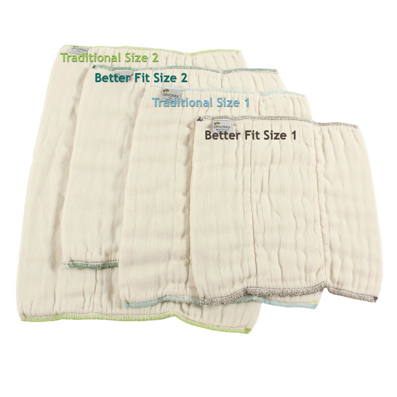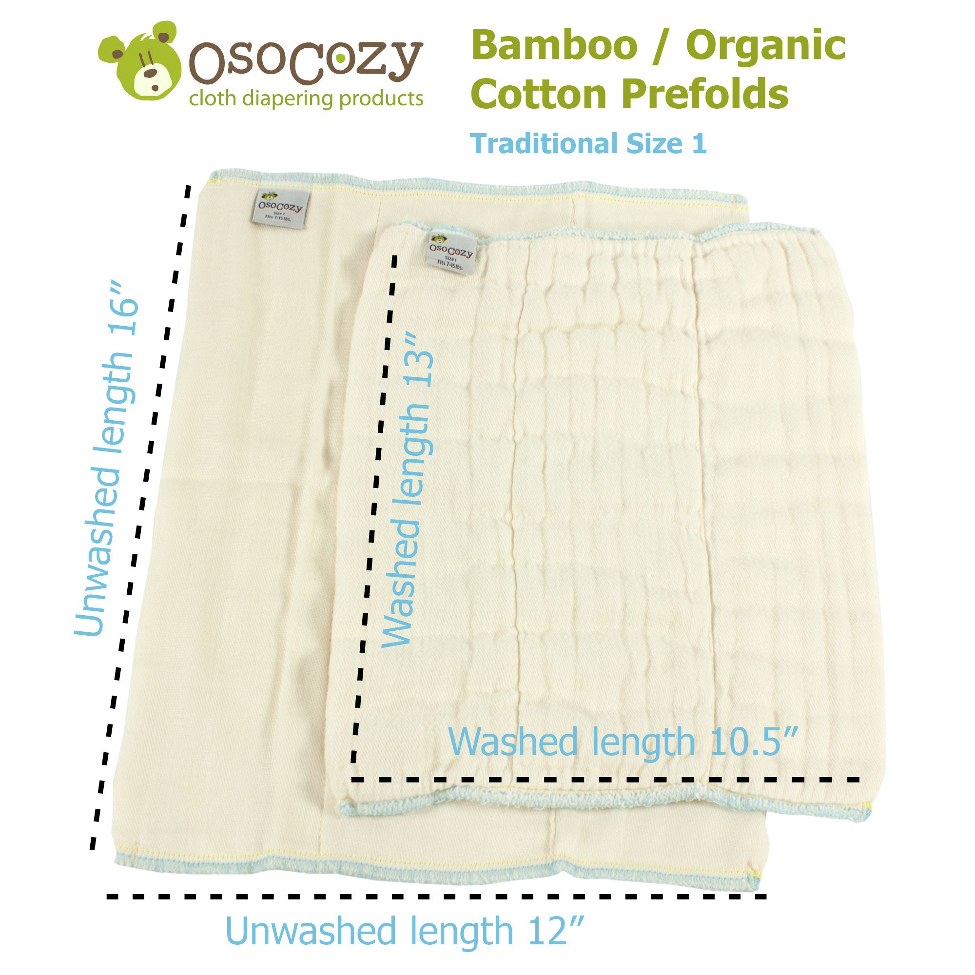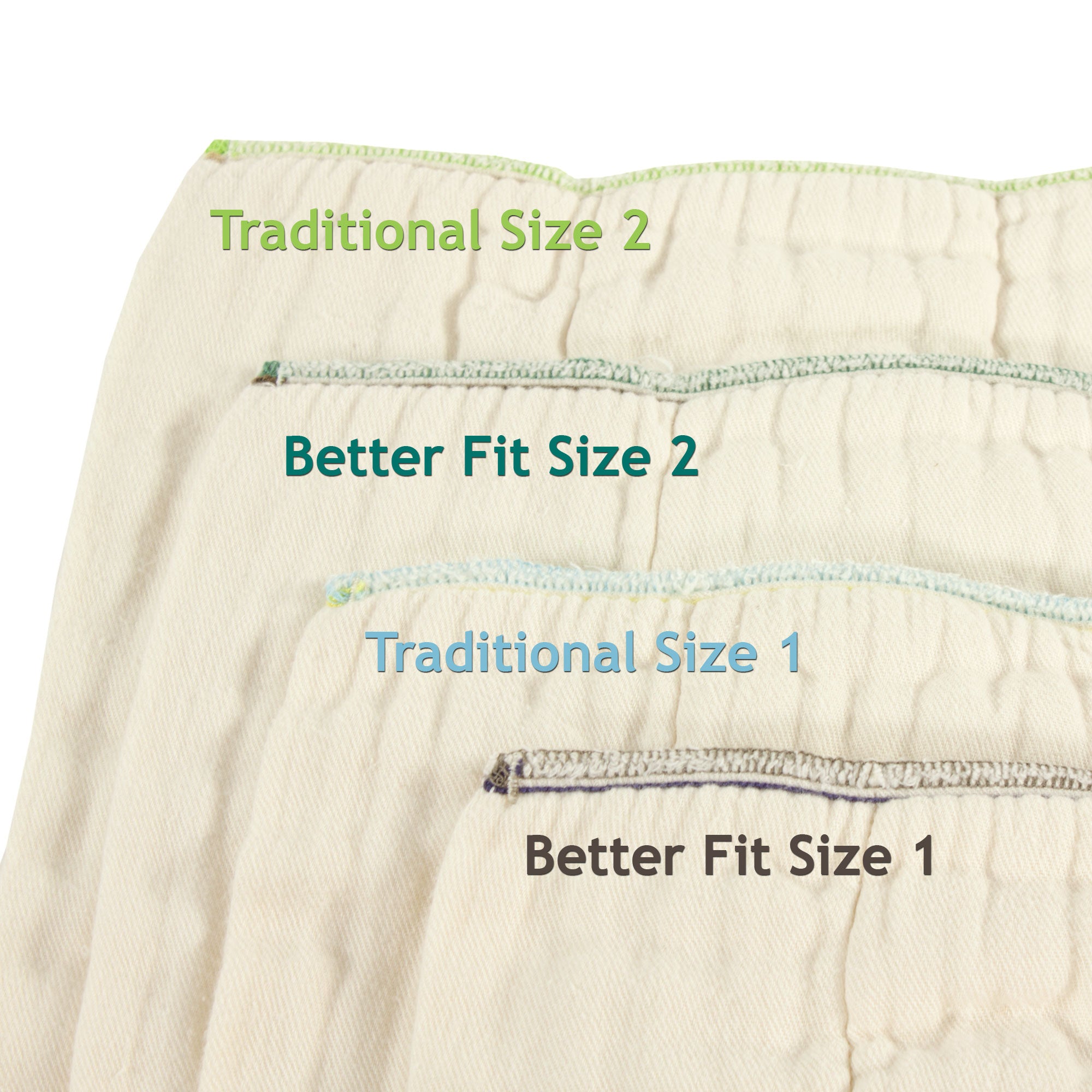 Bamboo Organic Prefold sizes. The Bamboo Organic prefolds come in both Traditional and Better Fit styles. There is an infant and premium size for each style. All sizes are attractively surged/edged in two-toned edging colors that allow for easy size identification. To understand the difference between Traditional and Better Fit see the section below the size chart and folding instructions below.