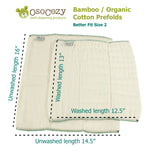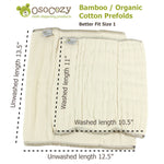 Bamboo Organic Prefold sizes. The Bamboo Organic prefolds come in both Traditional and Better Fit styles. There is an infant and premium size for each style. All sizes are attractively surged/edged in two-toned edging colors that allow for easy size identification. To understand the difference between Traditional and Better Fit see the section below the size chart and folding instructions below.