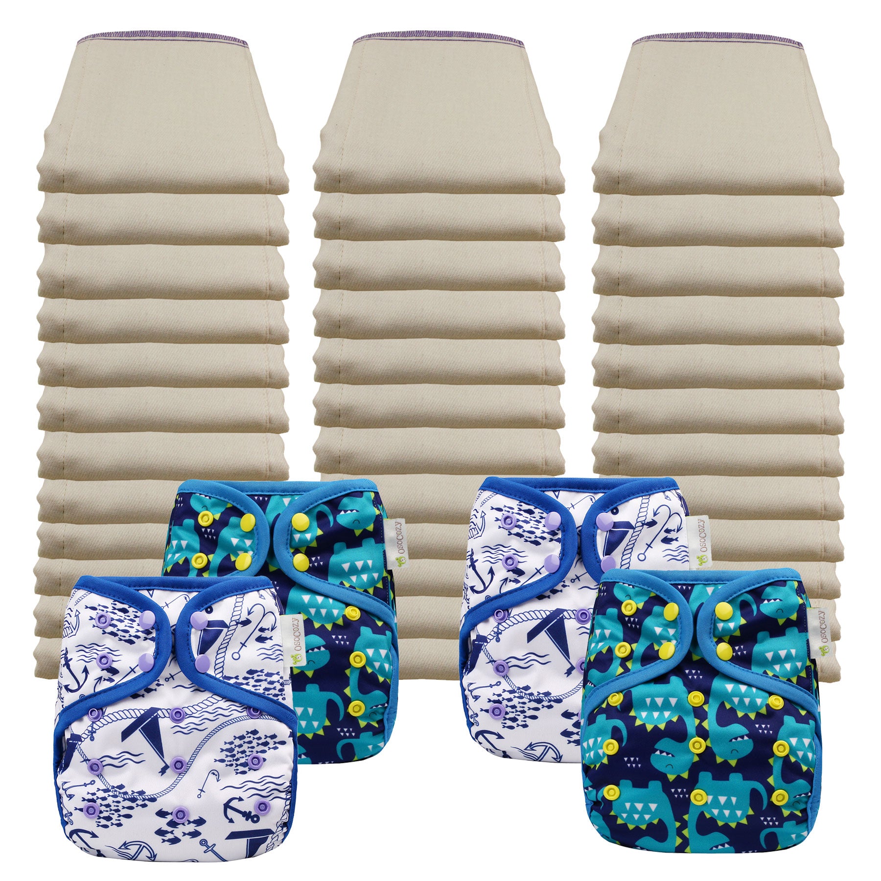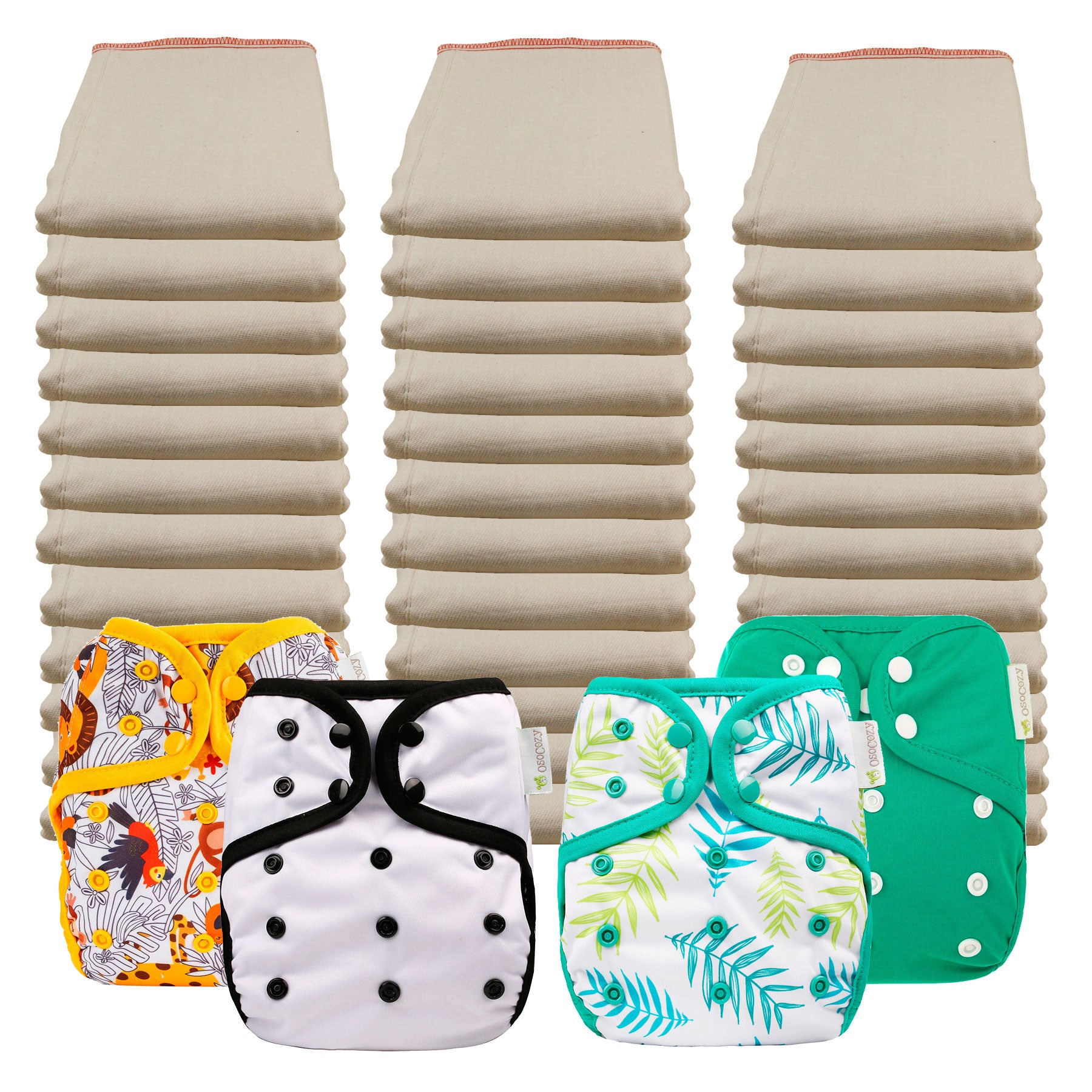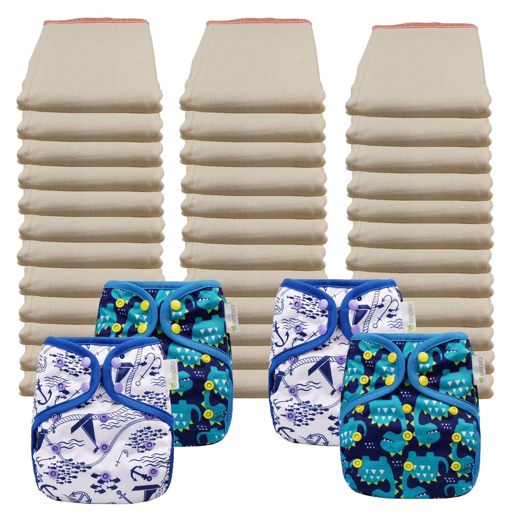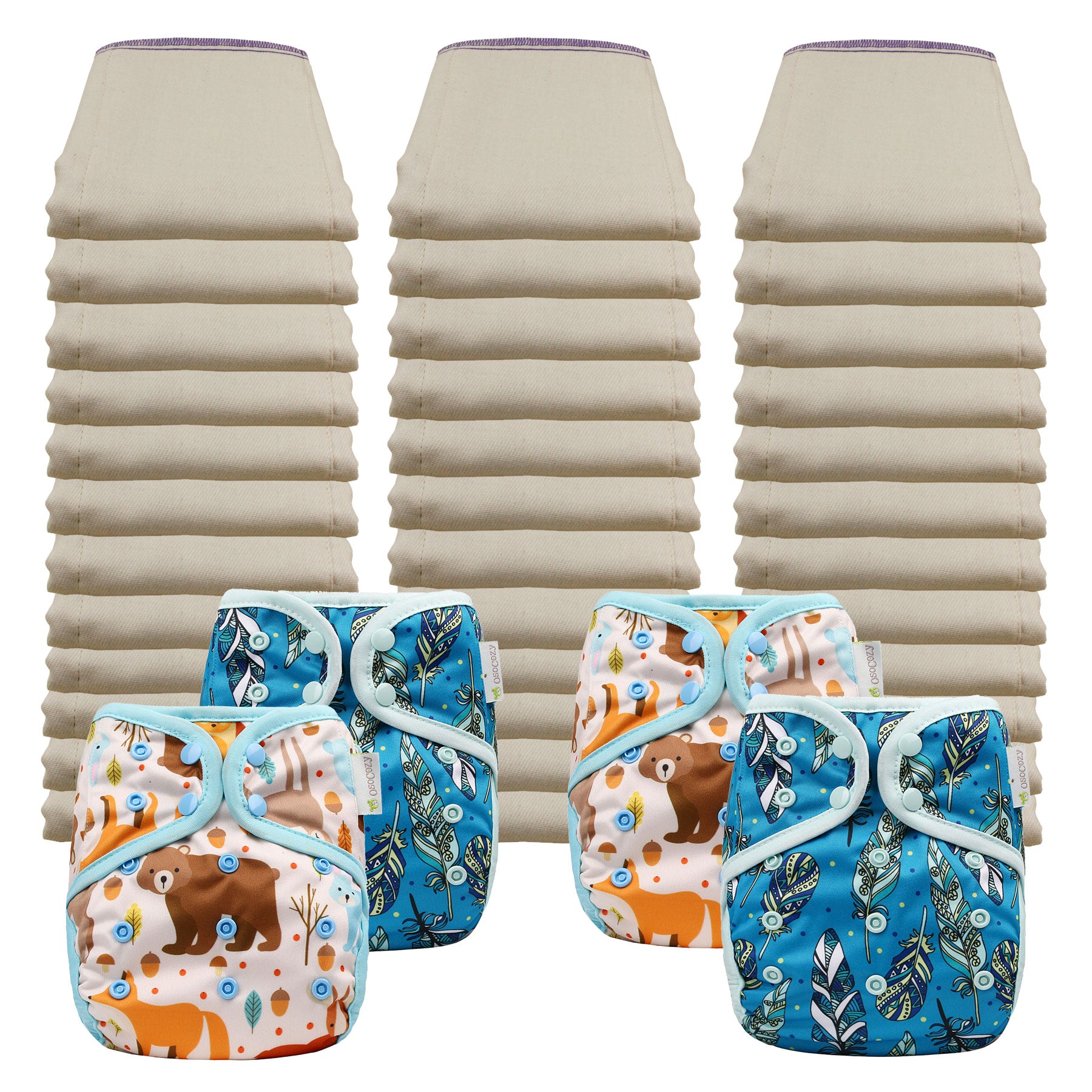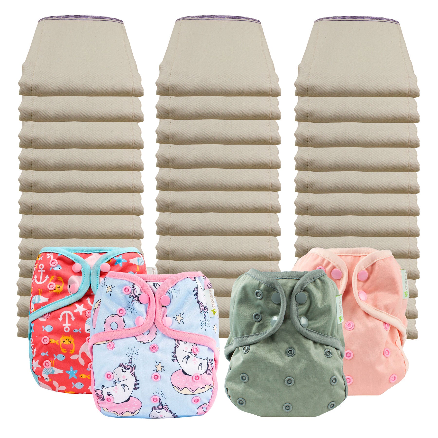 - 4 OsoCozy One Size Diaper Covers - In your choice of color or pattern. Note: These covers will fit both sizes of diapers so, if you start in the Infant size, you will only have to buy the Regular sized prefolds and not the covers when your baby grows into the larger size.