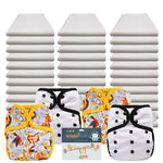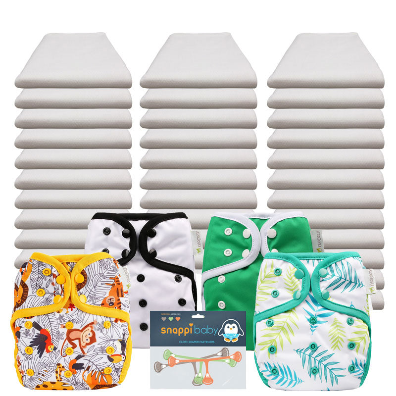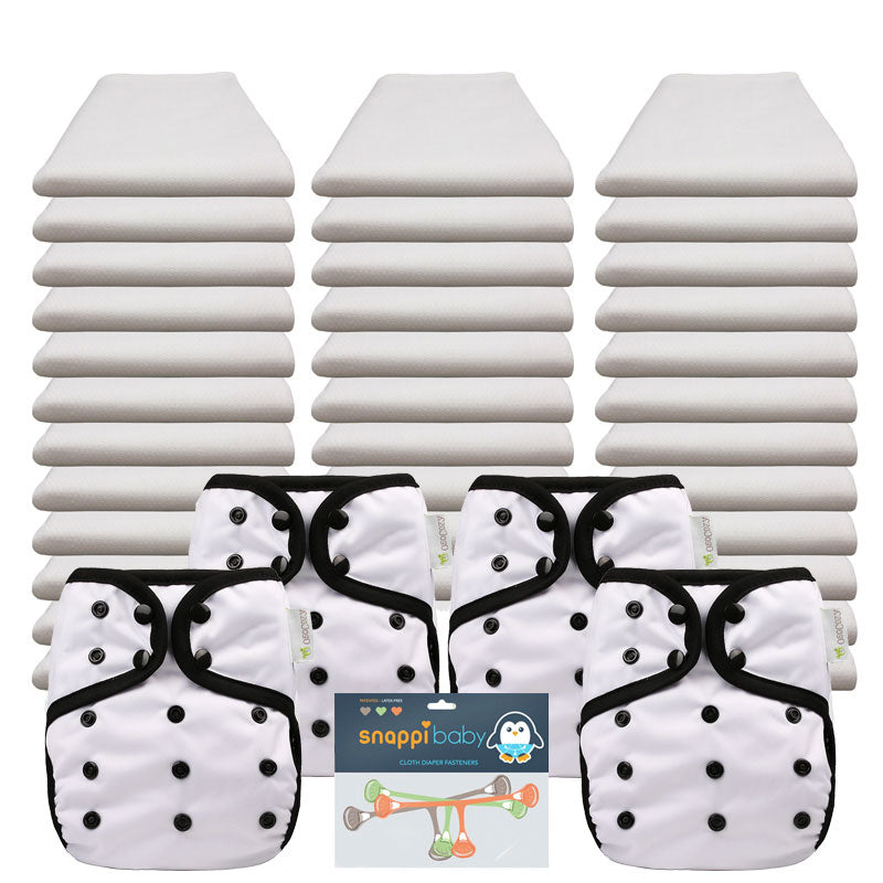 Our super soft Osocozy Bleached Flats are paired with our OsoCozy One Size Diaper Covers and a 3 pack of Snappi Diaper Fasteners. With 36 flat diapers you will be able to launder once every 3 or 4 days and have the option of ordering additional diapers and covers if you decide you need a few more. With our one size diaper covers this package will cover your baby from approximately 6-30 lbs.
