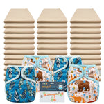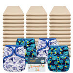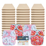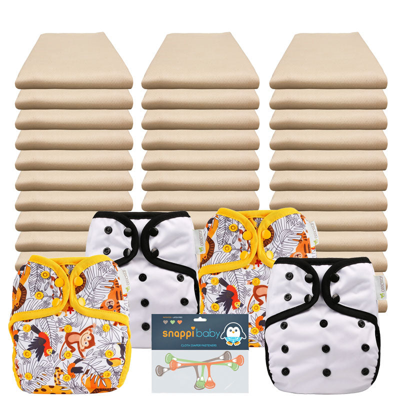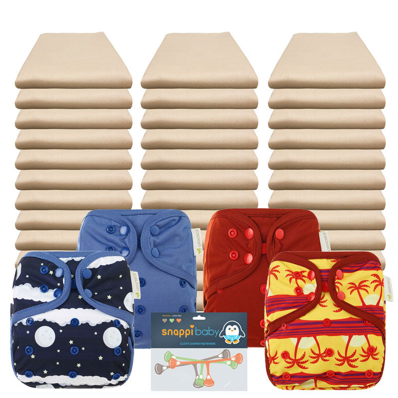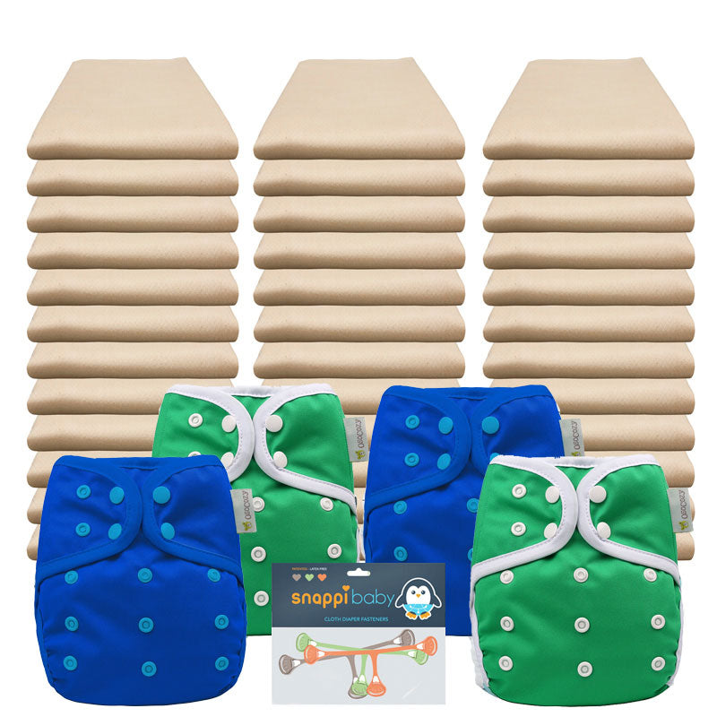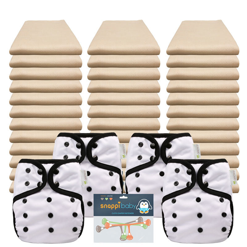Our super soft Osocozy Organic Flat Cloth Diapers are paired with our OsoCozy One-Size Diaper Covers and a 3-pack of Snappi Diaper Fasteners. With 36 flat diapers you will be able to launder once every 3 or 4 days and always have the option of ordering additional diapers and covers if you decide you need a few more. With our one size diaper covers this package will cover your baby from approximately 6-30 lbs.