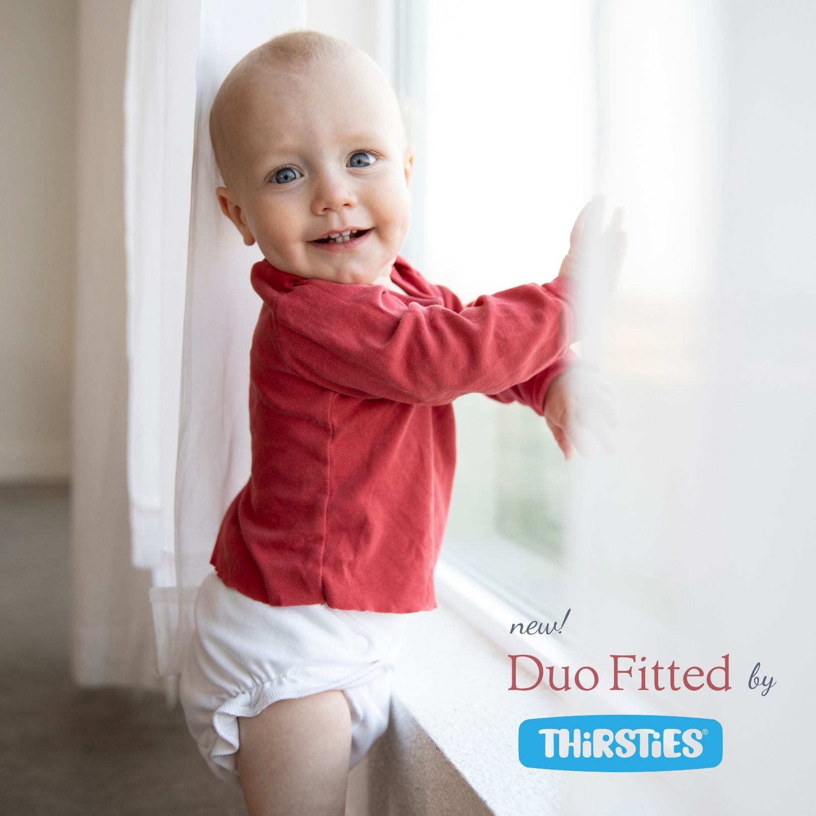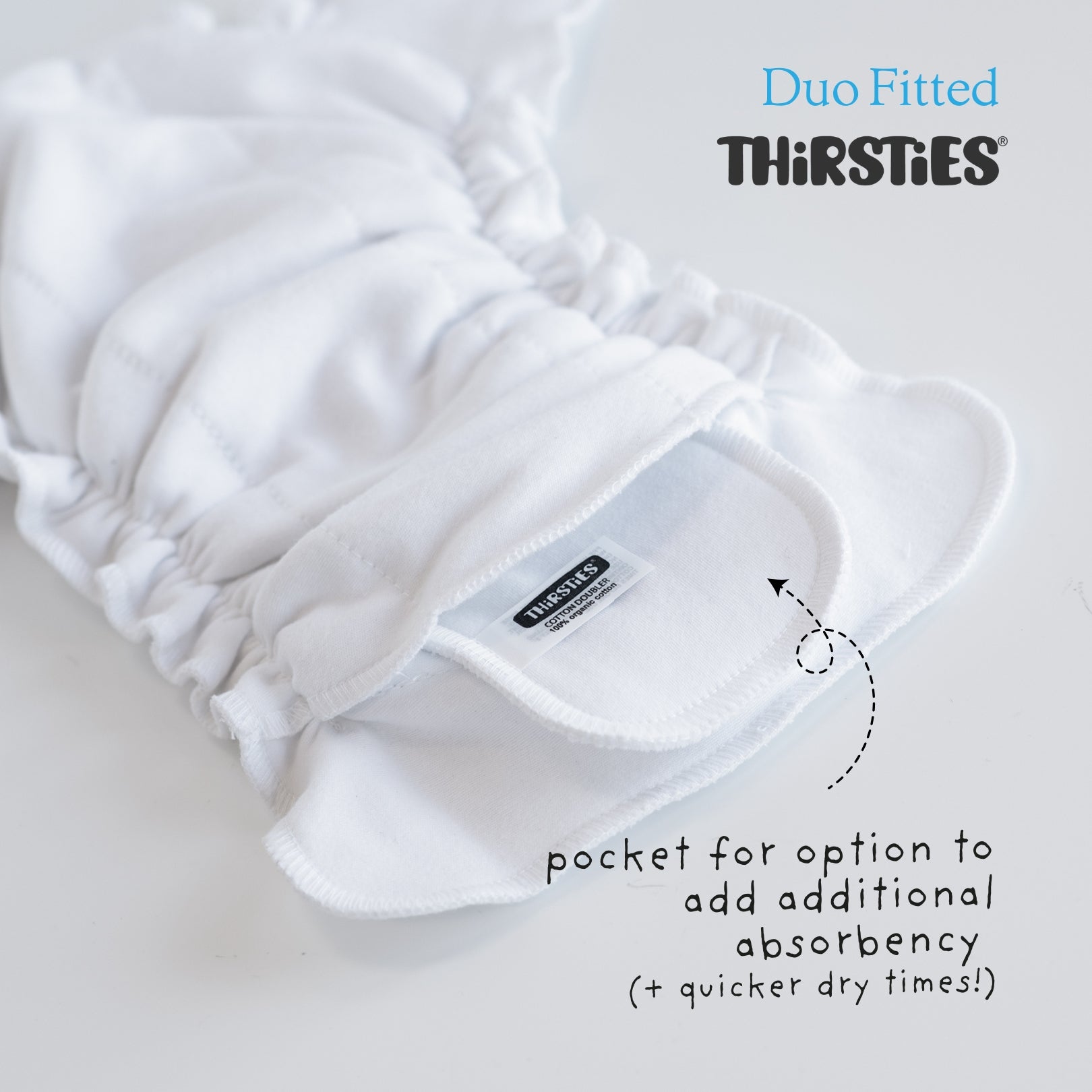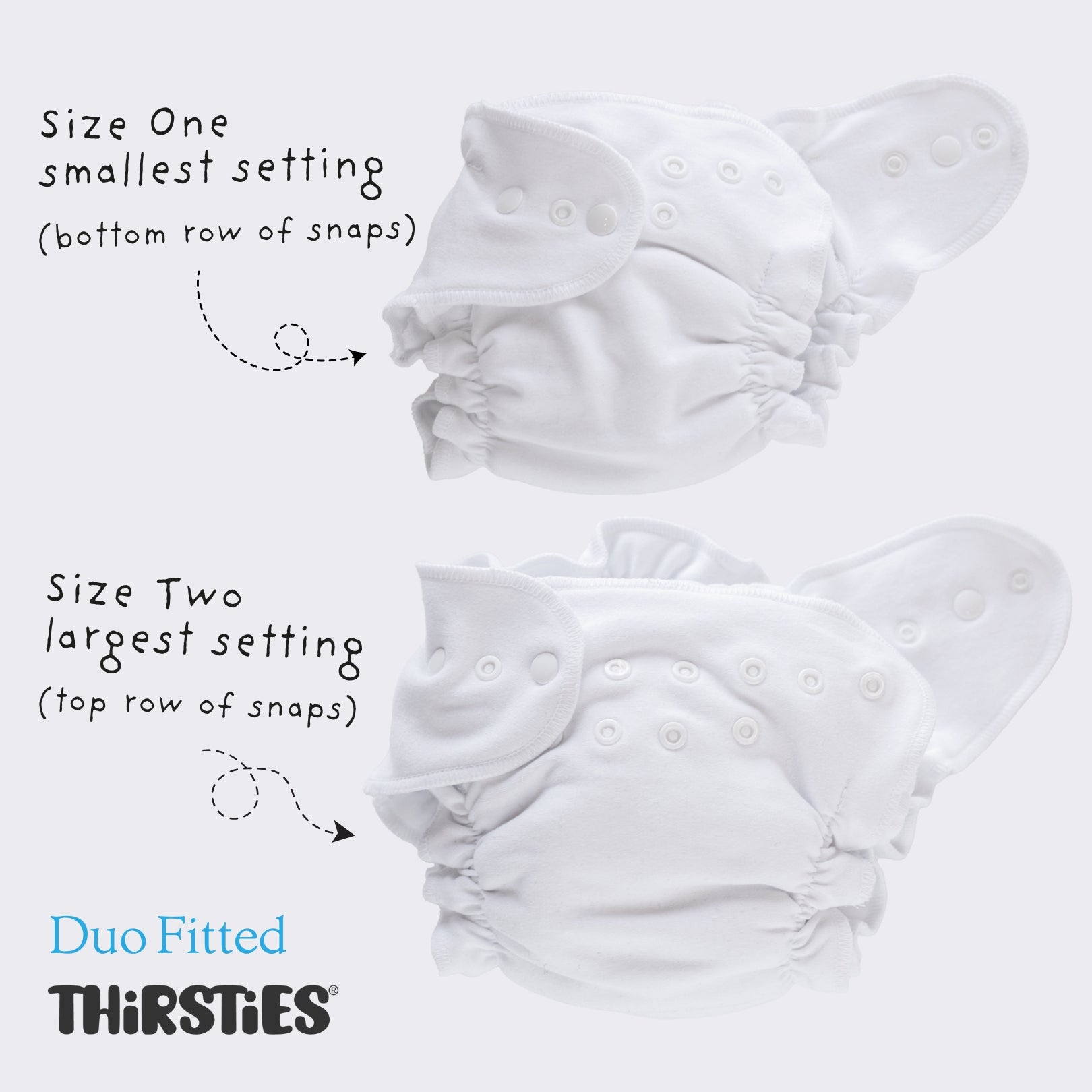 Fitted diapers offer unbeatable defense against disastrous blowouts. The Thirsties Duo Fitted is lovingly made with divinely soft and pliable organic cotton interlock. Two sizes cater to your little one's needs from infancy to mastering the potty. Pair a Duo Fitted with a Duo Wrap for a match made in heaven - no leaks, no worries.
